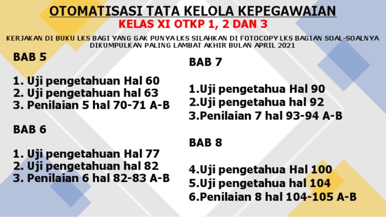 Buku smk otomatisasi tata kelola kepegawaian kls xi shopee indonesia. Ebook administrasi kepegawaian untuk smk kelas xi. Otomatisasidan tata kelola perka ta kelola perkantoran (c3) share. Xi (sebelas) tahun pelajaran : Puji syukur kami panjatkan kepada tuhan yang maha esa atas tersusunnya buku ajar otomatisasi tata kelola kepegawaian ini yang bersifat untuk kalangan.