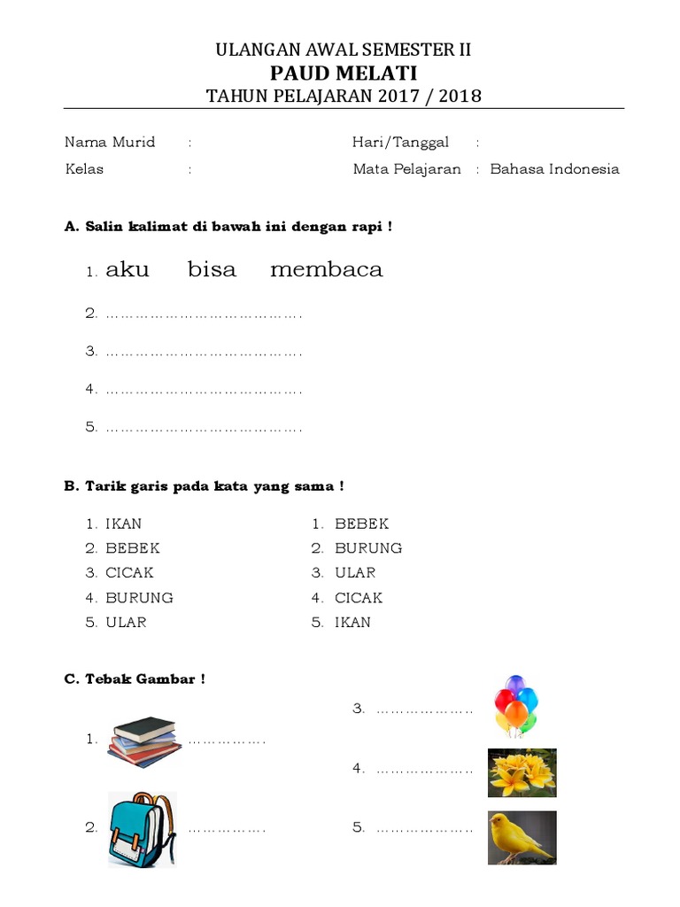 Doc soal bahasa arab kelas 2 nur rofiq academia edu. Soal menempel gambar hewan kata untuk paud. Contoh soal berhitung untuk anak tk b contoh soal berhitung untuk anak tk b rabu 5 desember 2018 1025 informasi lowongan yang anda cari adalah contoh soal berhitung. Evaluasi pembelajaran sangat diperlukan untuk semua jenjang termasuk pada pendidikan anak. Dibawah ini kami telah mengumpulkan contoh soal tes p3k guru tk atau paud lengkap dengan jawabannya dalam bentuk seleksi kompetensi bidang (skb) yang dihimpun dari berbagai sumber, dapat diunduh secara gratis dan disediakan dalam penyimpanan media google drive.