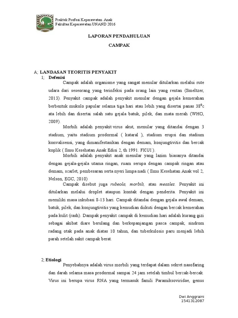 Penyakit campak disebabkan oleh virus rubeola,. Mahasiswa dapat memberikan asuhan keperawatan pada anak dengan diagnosa medis campak. Gejala campak dimulai dengan demam, hidung berair, . Campak disebabkan oleh paramyxovirus, virus dengan rantai tunggal rna yang memiliki satu tipe antigen. Doc askep morbili dewi 1997 academia edu.