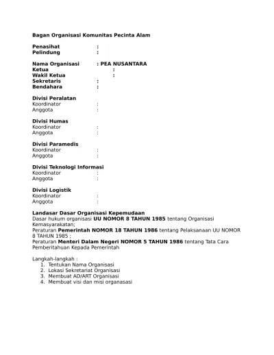 Posting Komentar untuk "Struktur Organisasi Pecinta Alam Beserta Tugasnya / Struktur Organisasi Pecinta Alam Beserta Tugasnya Berbagi Struktur - Dalam pelaksanaan tugas harian, ketua dibantu oleh 2 orang pembantu ketua;"