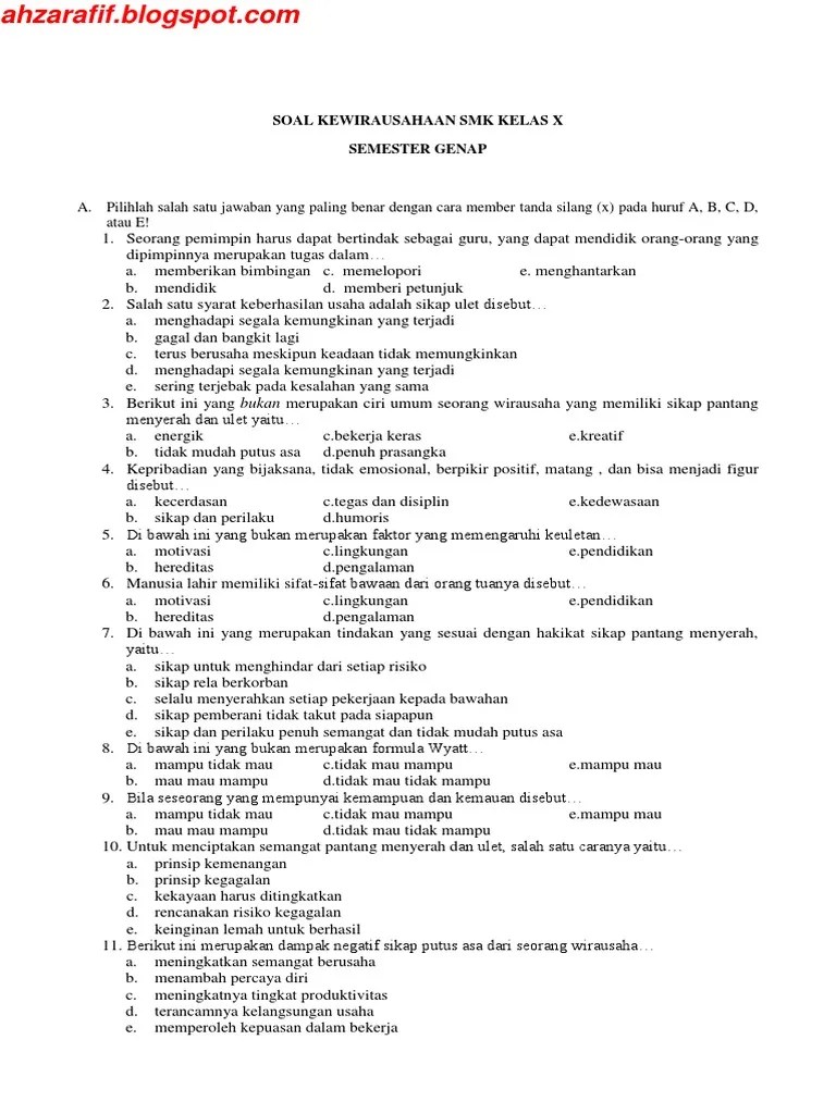 Soal pilihan ganda kewirausahaan kelas xii semester 1 soal essay.